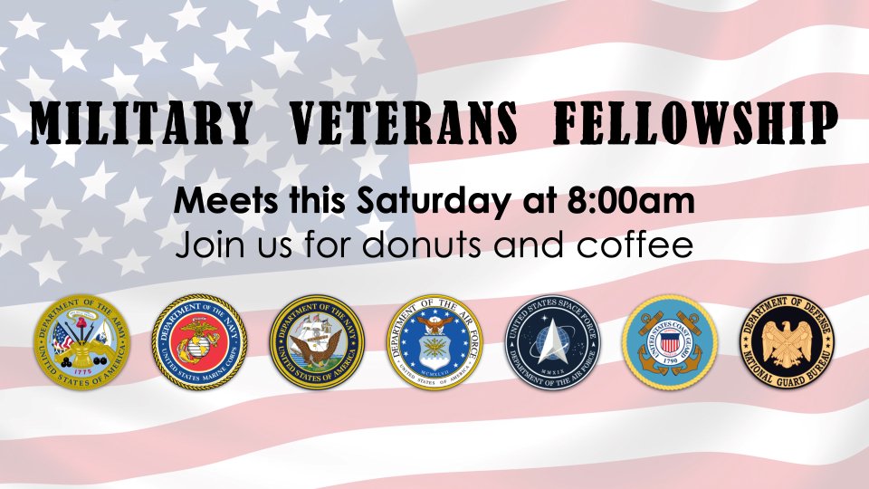 The Veteran's Fellowship meets the 3rd Saturday of every month. If you are a veteran, please join us Saturday, March 21st at 8:00 am at the church. Come enjoy coffee, donuts, and fellowship.