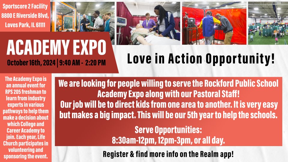 On Wednesday, Oct. 16th we are looking for people that would be willing to serve the Rockford Public School Academy Expo along with our Pastoral Staff at the Sportscore 2 Facility on Riverside Road near Costco. Our job will be to direct kids from one area to another. It is very easy but makes a big impact. This will be our 5th year to help the schools.