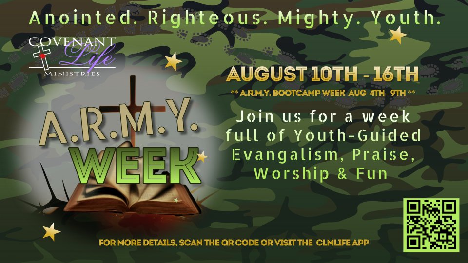 Join us for A.R.M.Y. (Anointed. Righteous. Mighty. Youth.) Week! The week begins on August 10th at our 10:00 AM Worship Service. Everyone is Invited! This is a youth-guided week of Evangelism, Praise, Worship, and Fun for the ENTIRE FAMILY, regardless of age. You don't want to miss out!