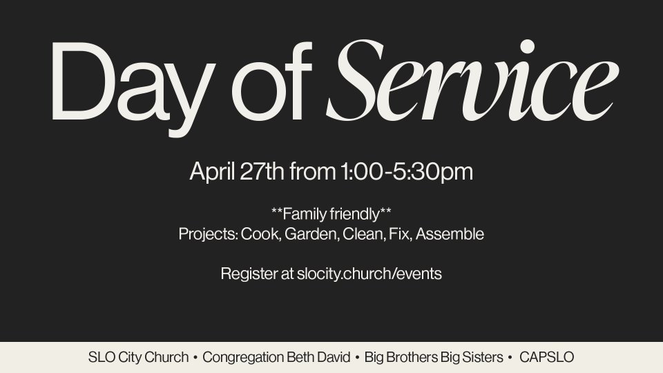SLO City Church and Beth David are doing a joint Day of Service on April 27th that will take place across the city! We will be serving CAPSLO and Big Brothers/Big Sisters.