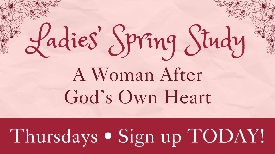 All women and young ladies are invited to join us for our Spring Study centered on Psalm 51:10. We will be studying through the second half of Elizabeth George's book, "A Woman After God's Own Heart" on Thursdays from January 15th to April 2nd.