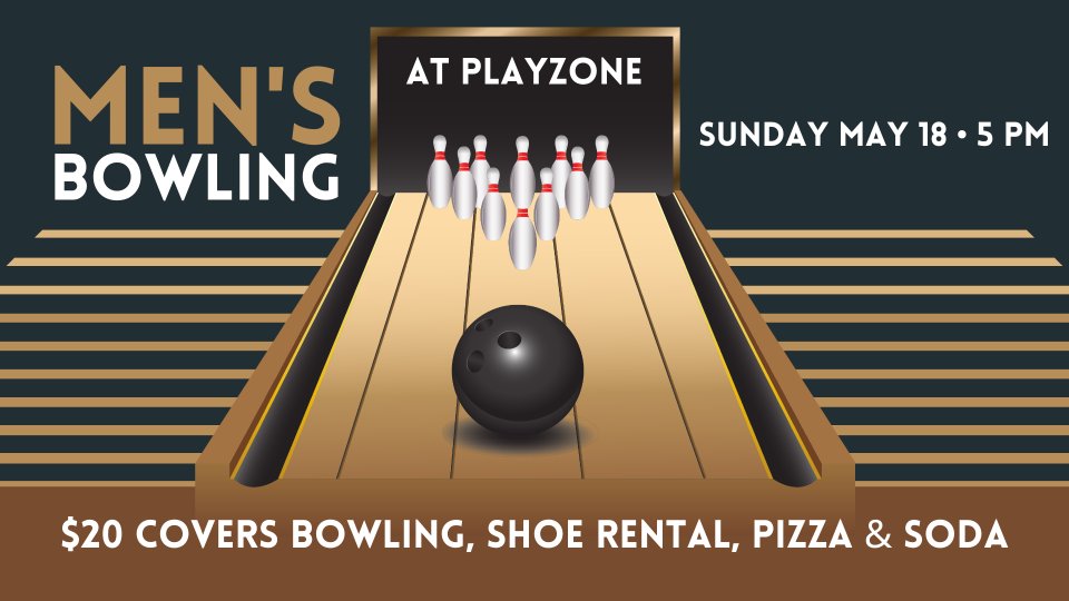 Guys—it’s time to hit the lanes for a night of fun, food, and friendly competition! Join us at PLAYZONE on Saturday, May 18, at 5 PM for Men’s Bowling Night.