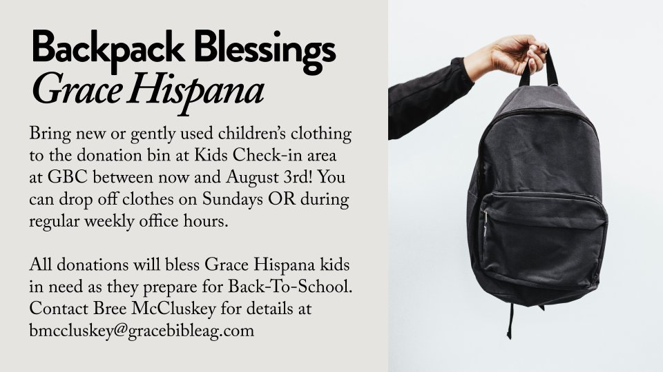 All donations will go directly towards Grace Hispana families and our local Hispanic community. Each child will receive a new backpack filled with these donated clothing items....a BACKPACK BLESSING!