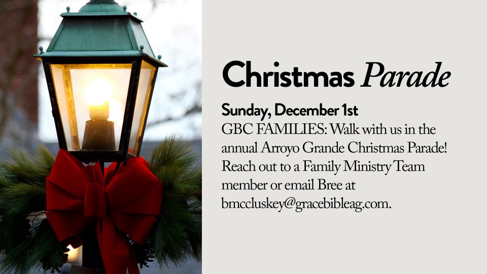 All GBC Families are invited to walk with us in the annual Arroyo Grande Christmas Parade! Wear your favorite ugly sweater or cozy Christmas pajamas! We will have bubbles and glowsticks for all participating kids. Let's represent the TRUE meaning of Christmas in our community!