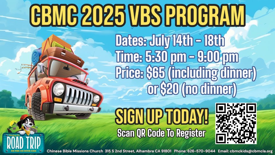 暑期兒童聖經班(VBS)將於7/14-7/18晚上5:30-9時舉行,歡迎幼稚園畢業至小六的兒童參加,報名費$65(包括5頓晚餐及制服1件)或$20(制服1件)。報名可按連結,如有任何查詢,歡迎與Dickson Kong主任聯絡。