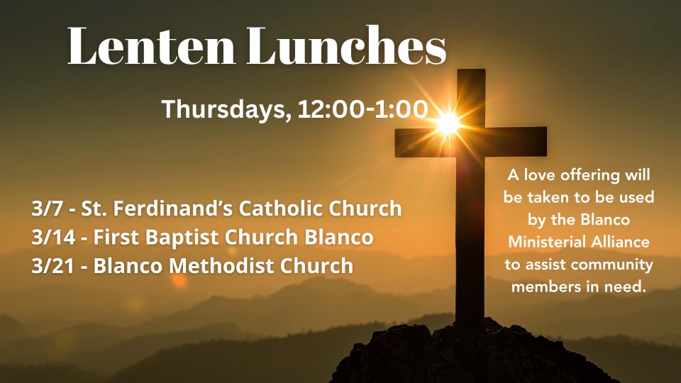 The Ministerial Alliance is working together to offer Lenten Lunches on each Thursday during the season of Lent. A host church will prepare a meal and offer a Lenten devotional. A love offering will be taken to be used by the Blanco Ministerial Alliance to assist members of the community in time of need.