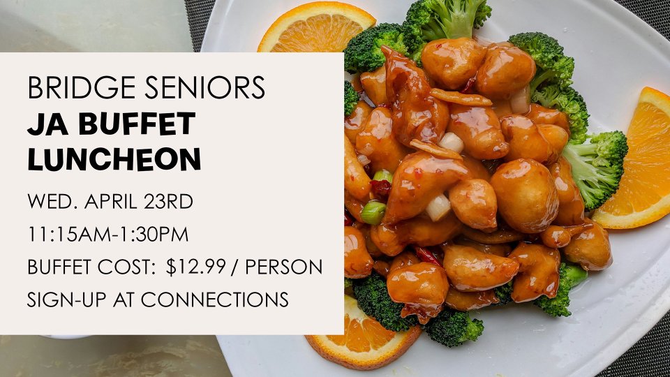 Bridge Seniors, you’re invited to join Pastor Mark and Sandy for fun, food & fellowship at JA Buffet in Hamburg! The hostess will walk everyone back to the private party room where we will gather to pray before visiting the buffet. Each person will pay for their own meal upon arrival. Please sign-up at Connections if you’re planning to attend.