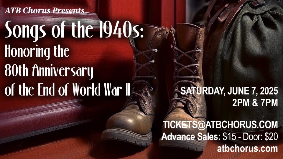 America the Beautiful Chorus (ATB) presents "Songs of the 1940s", honoring the 80th anniversary of the end of World War 2 and featuring our very special guest, 2024 International Champion Quartet Three & a Half Men. Tickets available at atbchorus.com or from Jim Lucey or Dennis Doyle.