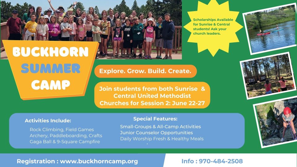 Join us for a week of overnight camp! Buckhorn is a United Methodist camp in Bellvue, CO for grades 3-10. Sunrise and Central UMC will be sending campers for Session 2, June 22-27.
