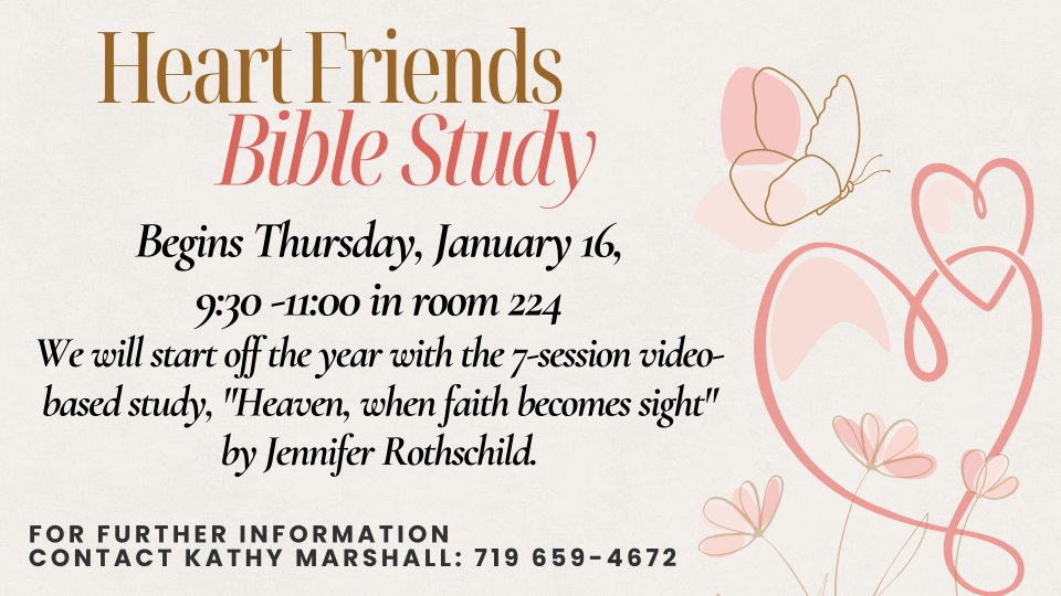 Heart Friends women's bible study will start on Thursday, January 16 in room 224. We meet every Thursday from 9:30 -11:00. We will start off the year with the study "Heaven, when faith becomes sight" by Jennifer Rothschild.
