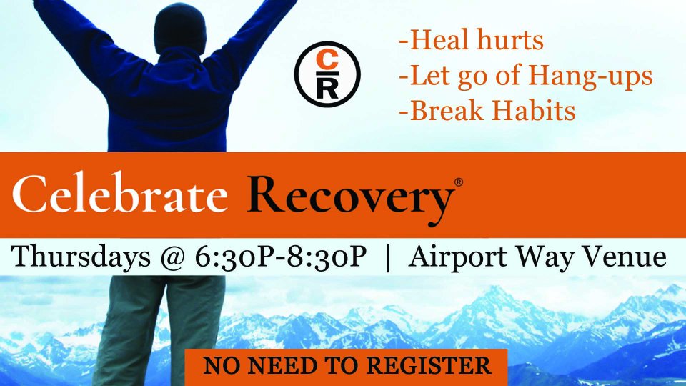 Celebrate Recovery is every Thursday at 6:30P! We meet every Thursday in 201 at our Airport Way location. We are so excited to partner with you in this journey as you overcome any hurts, hang ups and habits. We believe God is greater than all circumstances, and gave us community to overcome them in a supportive atmosphere. No need to register, just come! Childcare is available.