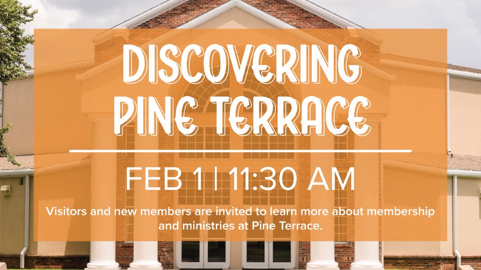 This event is intended for visitors and new members to get to know Pine Terrace, meet the staff, and learn about its history, vision, and ministries. Lunch and childcare are provided. This takes place immediately following the morning service in the Student Worship Center. Please register below