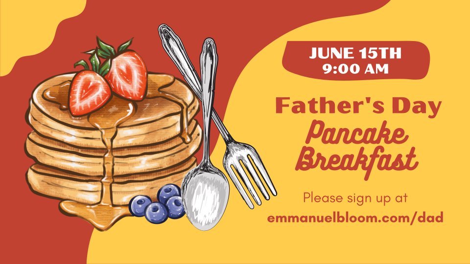 We will serve pancakes, bacon, sausage, orange juice, and coffee in place of our fellowship hour. Gluten-free pancakes and sugar-free syrup are also available.