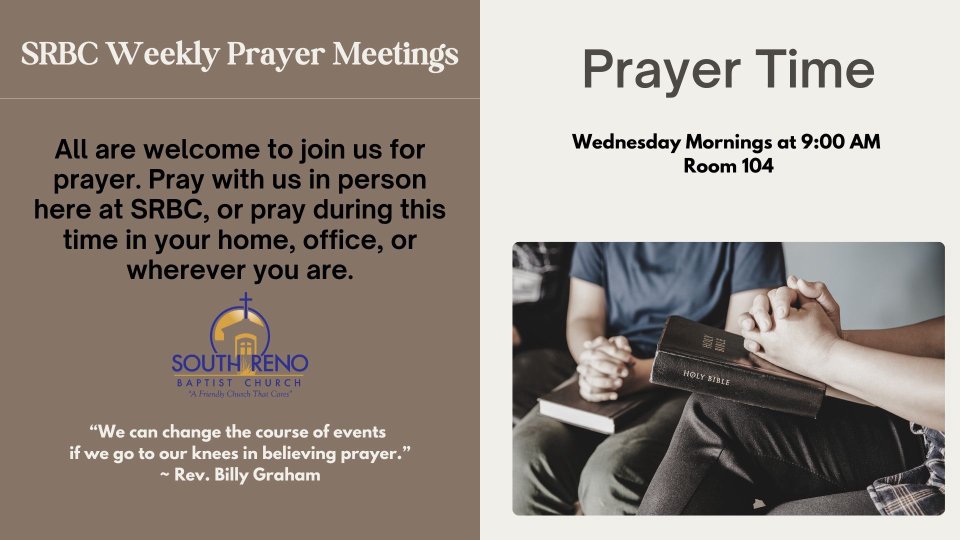 All are welcome to join us for prayer. Pray with us in person here at SRBC in room 104, or pray during this time in your home, office, or wherever you are.