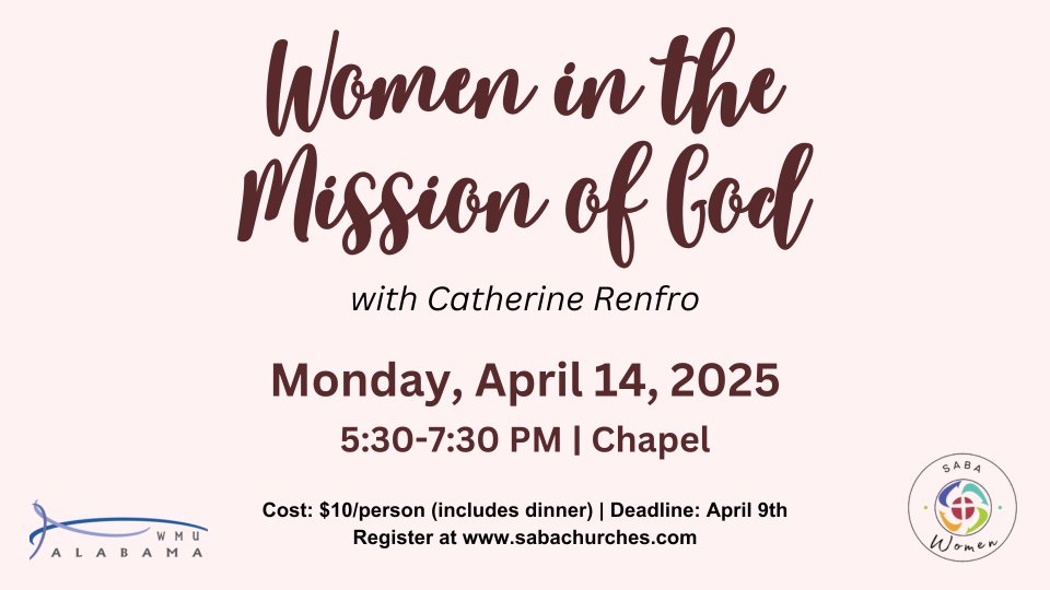 The FBC Women's Ministry is partnering with SABA and Alabama WMU for a special event on Monday, April 14, at First Baptist Church of Dothan. Catherine Renfroe, National Director of Women's Evangelism for the NAMB, will be our guest speaker, and Mary Kathryn Parrot will lead worship. We hope you'll join us for this meaningful time of encouragement and worship. The cost is $10/person (includes dinner). Register at www.sabachurches.com by April 9th to secure your spot.