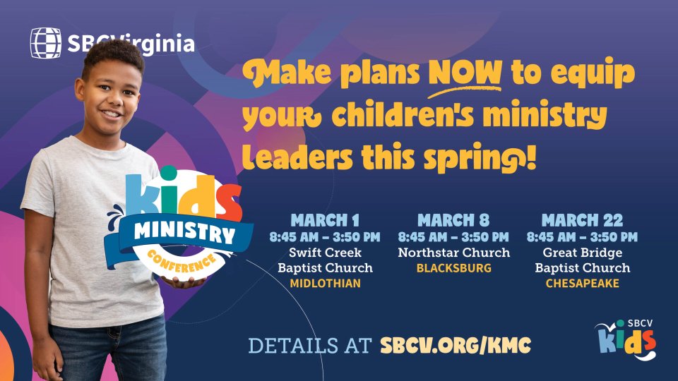 The SBCV Kids Ministry Conference is a FREE, six-hour conference providing and equipping you with resources for all areas of children’s ministry. You will receive great ideas and resources for your ministry, all FREE. The Conference will be held at Great Bridge Baptist Church in Chesapeake. Let us know you're attending by registering for this event. We will then register everyone as a group through the SBCV's website.