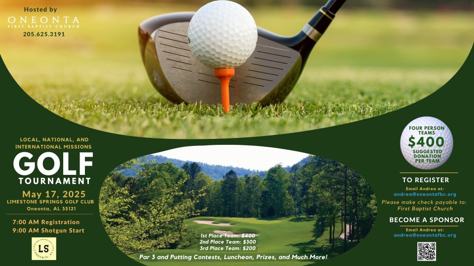 Missions Golf Tournament to support Local, National, and International Missions at Limestone Springs Golf Club. 7 AM Registration, 9 AM Shotgun Start. Each golfer receives a goodie bag, free entry to the par 3 contests, luncheon, & prizes—Four-person teams- $400 suggested donation per team.