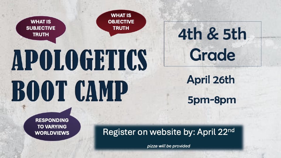 What is subjective truth? What is objective truth? These are some of the questions we will be answering as we host an apologetics booth camp for 4th and 5th graders. This is a great opportunity for your children to be equipped with the tools and knowledge to defend their faith. We are meeting on April 26th from 5-8pm. We will provide dinner. Please register by April 22nd.