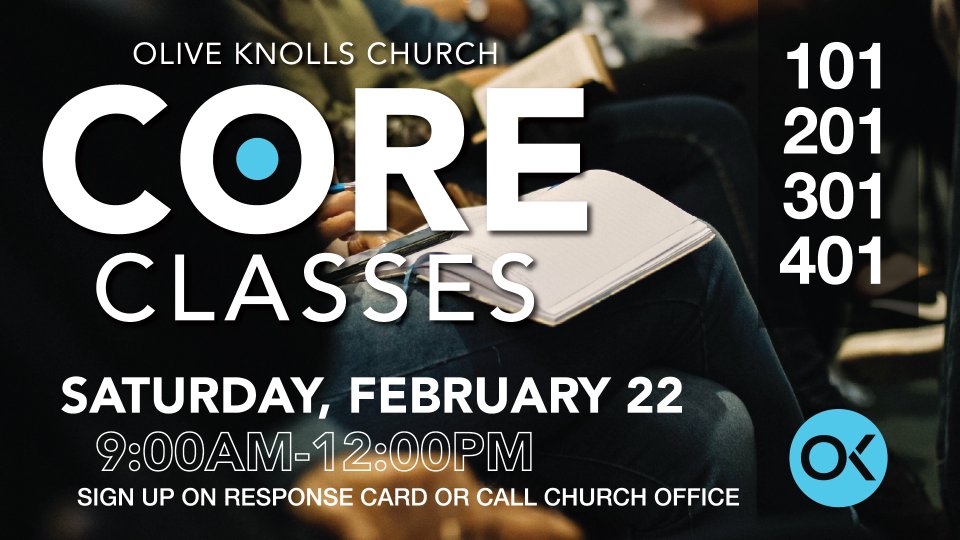 CORE Classes help you connect to Olive Knolls and deepen your walk with Christ. In November we are offering all 3 of our CORE classes. 101 - Discovering the Mission and Vision of Olive Knolls An introduction to the values, beliefs, strategy, and structure of the church led by Pastor Kevin Hardy. 201 - Discovering My Spiritual Maturity An introduction to growing in Christ. Topics: Daily Time with God, Prayer, Giving, Small Groups and other basic disciplines of the Christian life led by Pastor Brent Kall. 301 - Will not be offered this month. 401- Discovering My Life's Mission. This class is designed to help you find the mission for your life. This class will equip you with tools needed to share your faith in Christ with confidence and to serve others. This class teaches you how to share your faith and how to present the gospel. It will also introduce you to Local and World Missions. This class is led by Pastor Diane Ussery.