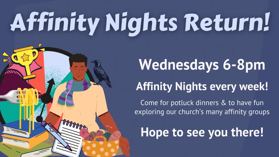 Affinity Nights are BACK at First Olympia! So come join us for free weekly potluck dinners and to have fun exploring our church's many affinity groups.