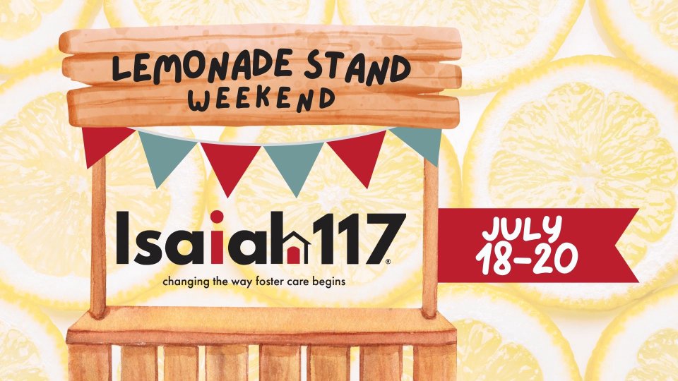 On the weekend of July 18-20 (July 20 being a Sunday), Isaiah 117 House will be holding a nationwide awareness and fundraiser called "Lemonade Stand." Isaiah 117 House is a nonprofit organization that provides physical and emotional support in a safe and loving home for children awaiting foster care placements. You'll be able to learn more about the ministry and how you can support them by stopping by the lemonade stand to grab a lemonade and a treat. They'll be set up outside our building on Sunday morning.