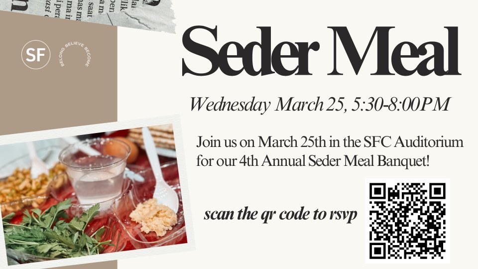 Join us on March 25, 2026, in the SFC Auditorium for our 4th Annual Seder Meal Banquet! All are welcome to join us as we step into a time of remembrance and fellowship together, sharing a delicious meal rooted in symbolic Jewish traditions and meaningful devotion together. Doors will open at 5:30 PM, and the service will conclude around 8:00 PM. Our Seder Meal will once again be led by the amazing Rabbi Neal Surasky, a devout believer in Jesus and leader of a Messianic Jewish Synagogue in Northern Virginia and representative from Chosen People Ministries, who will walk us through each step of the Passover meal and how they point to the roots of our faith in Exodus and the sacrifice of Jesus through His death and resurrection. Whether you come with family or on your own, this evening is a chance to connect, grow in faith, and enjoy community. Don’t miss out on this opportunity to gather, grow, and be encouraged. Please let us know of any food allergies you may have during registration.