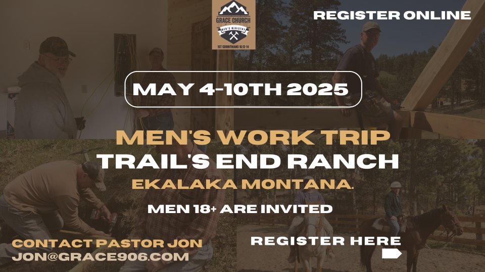 Men 18+, you are invited to join the Men of Grace as they serve at Trails' End Ranch during this annual work trip in May. Registration is open online through April 30th. After that, please call the Church Office at 906-428-1331.