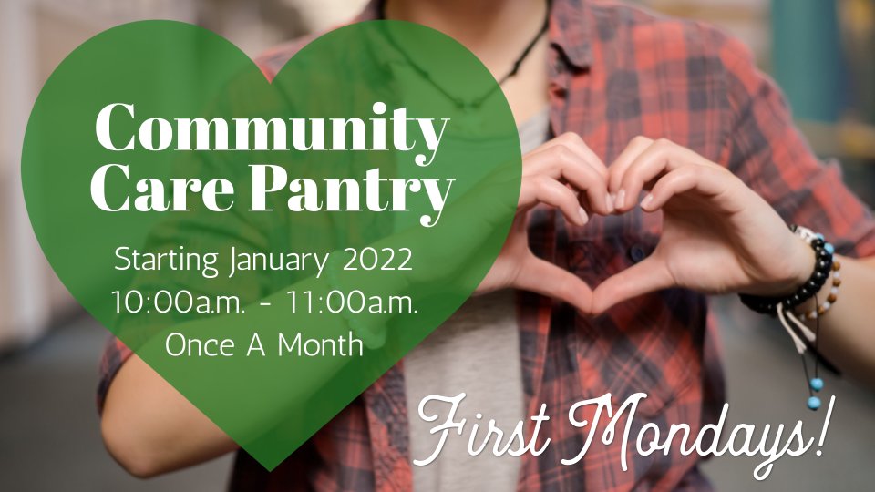 The Community Care Pantry hours of operation are the FIRST MONDAYS of the month, from 10:00 a.m. - 11:00 a.m. The pantry will be closed on all other days.