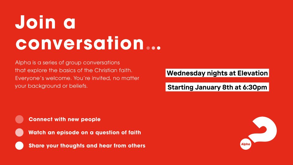 Join us at Elevation Church this January for the Alpha Course—a welcoming and interactive series designed to explore life, faith, and the big questions in a relaxed and friendly setting. Whether you're curious about Christianity or looking to deepen your understanding, Alpha is for everyone. Enjoy engaging discussions, a warm community, and great food as we journey together. Starts January 2025!