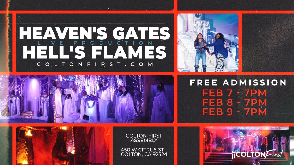 "Heaven's Gates, Hell's Flames" is a powerful and thought-provoking theatrical production that has been captivating audiences for years with its intense and emotionally charged performances. This production skillfully explores themes of faith, salvation, and the consequences of life choices. Through a combination of dramatic storytelling, compelling acting, and mesmerizing special effects, the play takes viewers on a journey through the contrasting realms of heaven and hell, offering a vivid and thought-provoking portrayal of the afterlife. With its dynamic and immersive presentation, "Heaven's Gates, Hell's Flames" continues to leave a lasting impact on its audiences, challenging them to reflect on their own beliefs and life decisions. Admission is Free.
