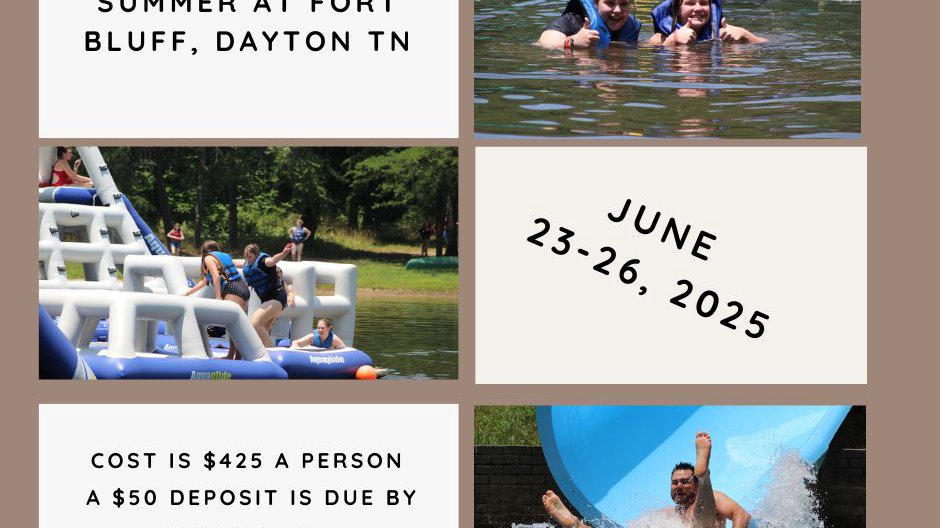 2025 KIDS SUMMER CAMP: Kids who have completed 3rd - 5th grade will attend Student Life Camp this Summer at Fort Bluff in Dayton, TN. Fort Bluff is set atop Dayton Mountain and is absolutely gorgeous and is a perfect place for camp! It has amazing free time options including an activity lake with a BLOB, pool, water slide, Gaga Ball and Human Foosball! The dates are June 23-26, 2025. The price for camp is $425. A $50 deposit is due by January 26. Sign up online today!