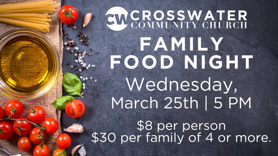 Join us for Family Food Night! An evening filled with a delicious meal and meaningful connection. This is a great opportunity to relax, reconnect, and build community together. Whether you're new to Crosswater or have been here for years, there's a seat at the table for you. Bring the whole family and enjoy an awesome night of food and fellowship. Please register online so we can plan well for you!
