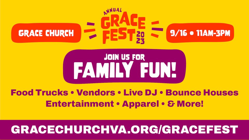 Mark your calendars and get ready for the 2nd Annual Grace Fest! This will be a family-friendly day full of fun, laughter, food, music and entertainment. We will have amazing local vendors, delicious food trucks, a live DJ, bounce houses and plenty of fun activities for all ages. We will also give back to the community by hosting a Coat Drive. So, bring new or gently used coats and blankets to the event. Also, be sure to bring your lawn chairs, family and friends for this fun day of fellowship and outreach. Then, join us for Back to Church Sunday Service on September 17th at 8:30am or 10:30am. This is a free event for everyone! We look forward to seeing you there. If you are interested in being a vendor or food truck, please visit https://gracechurchva.org/gracefest for more details. Vendor applications must be submitted by August 31st.