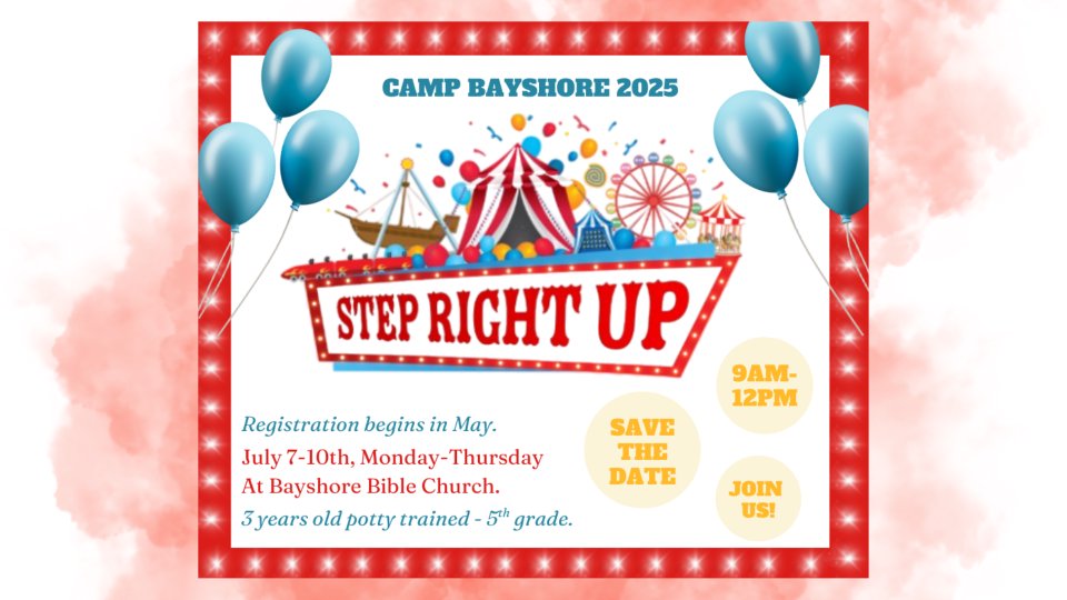 Children 3 years potty trained to 5th grade join us for fun games, crafts, snacks & exciting Bible lessons. Parents can register your children online at bayshorebible.org