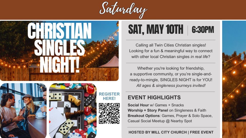 Christian Singles Event: Calling all Twin Cities Christian Singles! Looking for a fun & meaningful way to connect with other local Christian singles in real life? The free event includes a social hour at 6:30 pm, a worship & story panel on Singleness & Faith at 7:30 pm and breakout options at 9 pm on Saturday, May 10 at Mill City Church (68513th Ave NE, Minneapolis). Scan the QR code or register at Mill City Church. See the poster in the church lobby for more information, or contact Hannah Rasmussen.