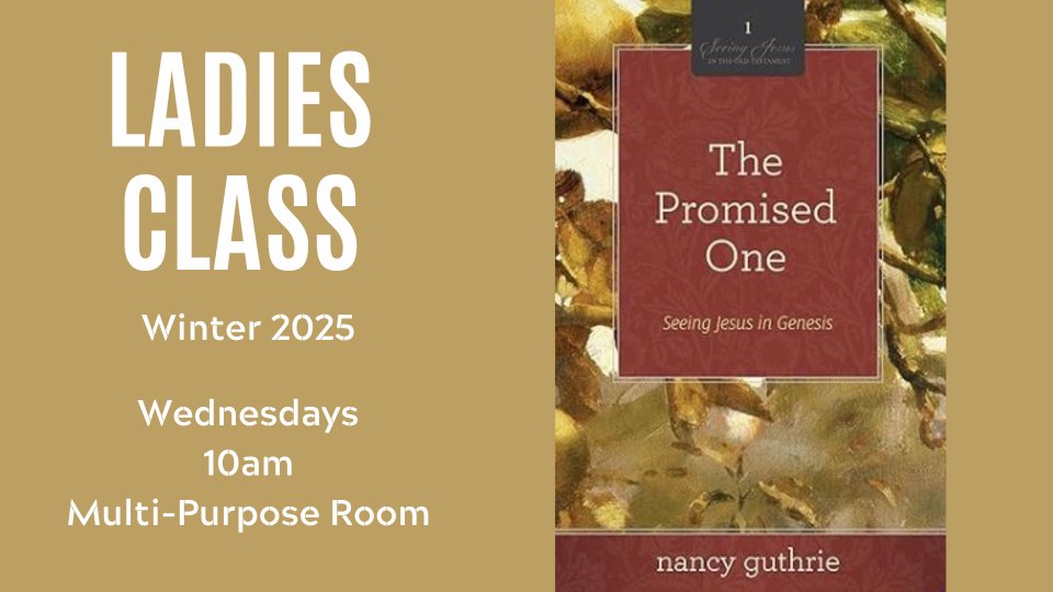 Our current new series for ladies class is entitled "The Promised One: Seeing Jesus in Genesis". We will continue this study until the DVDs for season 5 of "The Chosen" are available. Join us on Wednesday mornings at 10am.