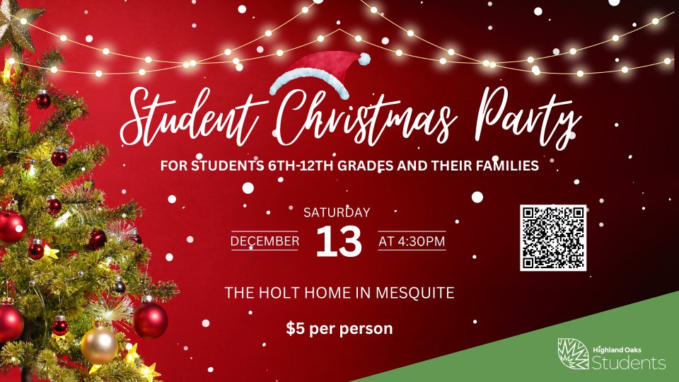 Students 6th-12th grade and their families are invited to the Student Christmas Party Saturday December 13th from 4:30-6:30 pm at the Holt household in Mesquite, TX. Cost is $5 per person.