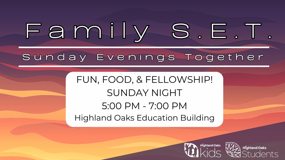 Join us for Family S.E.T. this Sunday, March 9th, from 5-7PM. Bring your own food and prepare for games and worship together!