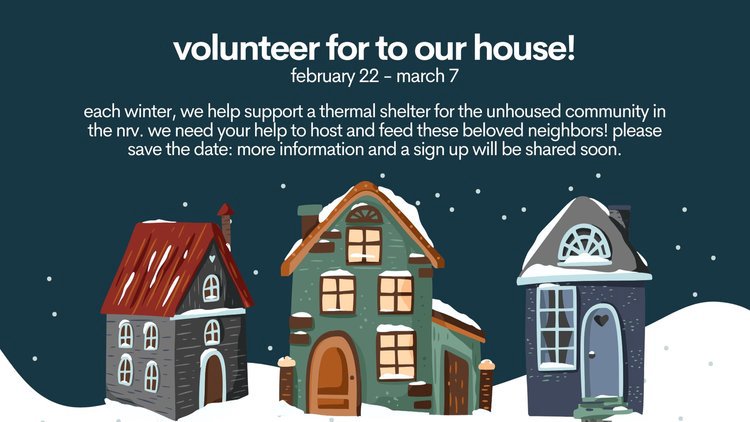 BUMC will host the To Our House Homeless Shelter Mission February 22-March1. Please help continue this important mission. If you have questions please don't hesitate to contact Beth O'Connor at jonplusbeth@yahoo.com or 540-553-1012.