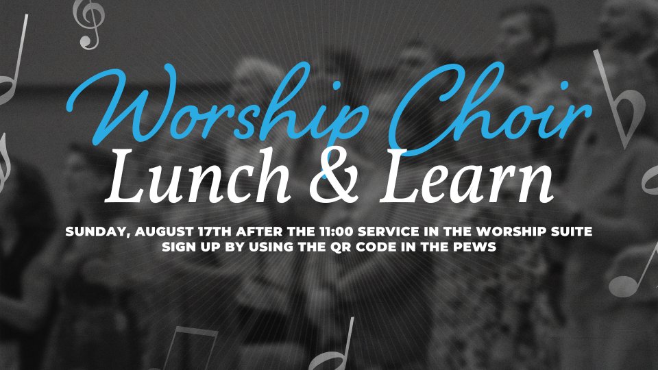 Join us on Sunday, August 17th to learn more about the Worship Choir. The Lunch & Learn will be held in the Worship Suite (across from the KIDS Area) after the 11:00 service. Discover the vision, preview the music, and find your place in the song. Lunch and Childcare will be provided.