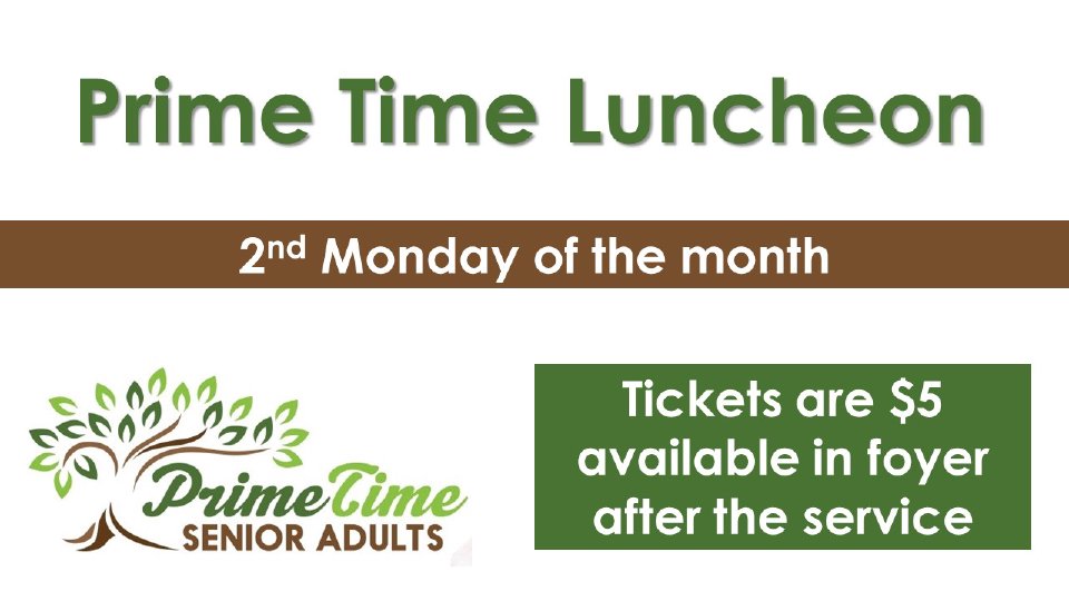 Join us for our monthly Prime Time luncheon on the second Monday of each month. We meet at 10am in the Fellowship Hall. Tickets are $5 and can be purchased at the Prime Time welcome center or by contacting the church office.