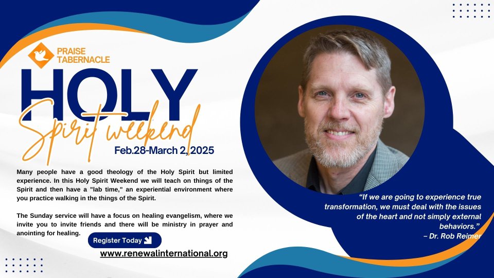 Speaker Rob Reimer. Register now! Join us for Holy Spirit Weekend—a time to learn about the Spirit and put that knowledge into practice. We'll offer hands-on sessions where you can step out in faith and grow in your walk with the Spirit. This weekend will inspire and encourage you to take bold steps in your faith journey. Don't miss this chance to fan the flames of your faith!