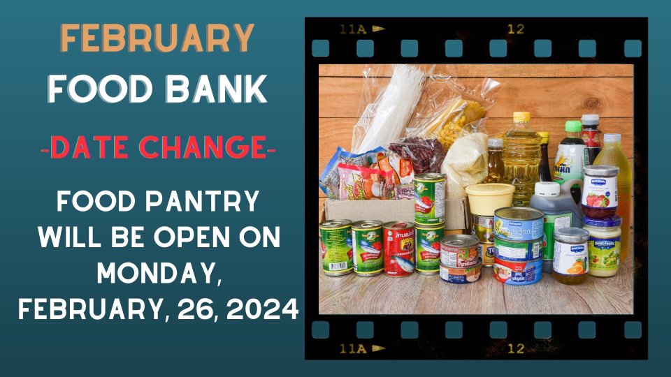 Serving our community by meeting their need. Every 3rd Monday of the month. The food bank is open for families or individuals in need. THIS MONTH ONLY the food bank will be held on the 4th Monday due to the holiday on Feb 19.