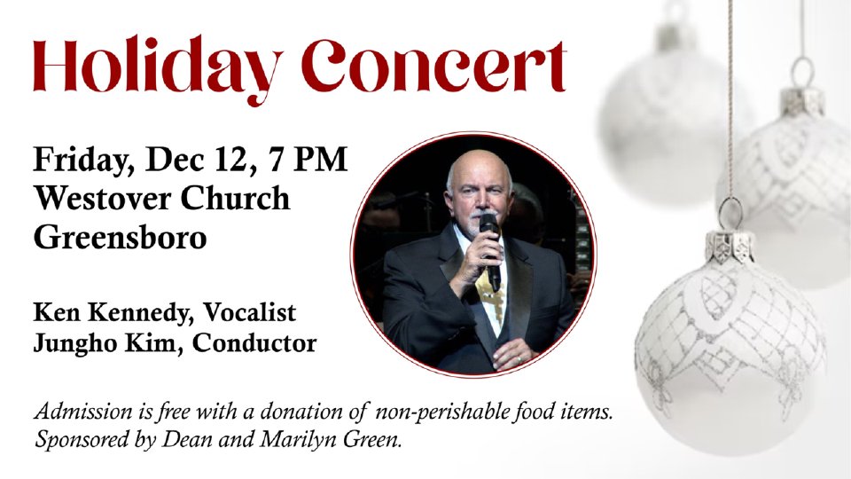Join the Greensboro Symphony for the annual Holiday Concert on December 12, 7:00PM (doors open at 6:00PM) at Westover Church. You will enjoy beautiful Holiday music with sing-alongs while celebrating the Holiday Season! Admission is FREE with a donation of non-perishable food items to benefit the Greensboro Urban Ministry. Ticket registration is required. Requested non-perishable donations: Canned soups / stews Mac & Cheese Tuna Chili with meat Rice / Pasta Dry Beans Peanut Butter (18 oz.) Crackers Oatmeal Ramen noodles Baby formula/food/diapers No glass containers or #10 cans.