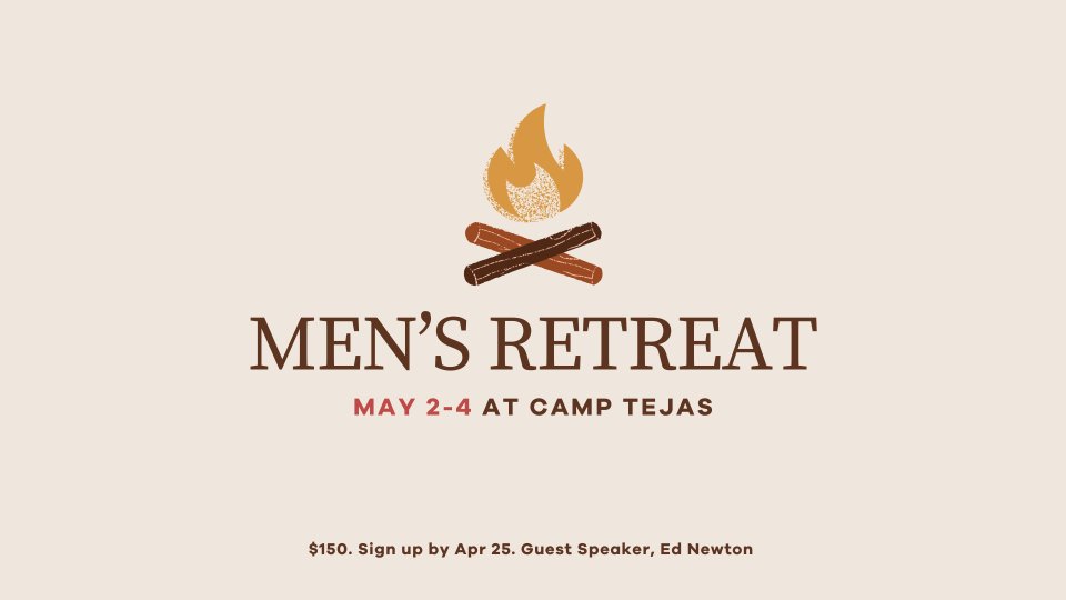Join us May 2-4 at Tejas Camp & Retreat for Oakwood’s Men’s Retreat. A weekend of retreat with like-minded men. Come hear speaker Ed Newton and build relationships with other men through games, worship, and food.