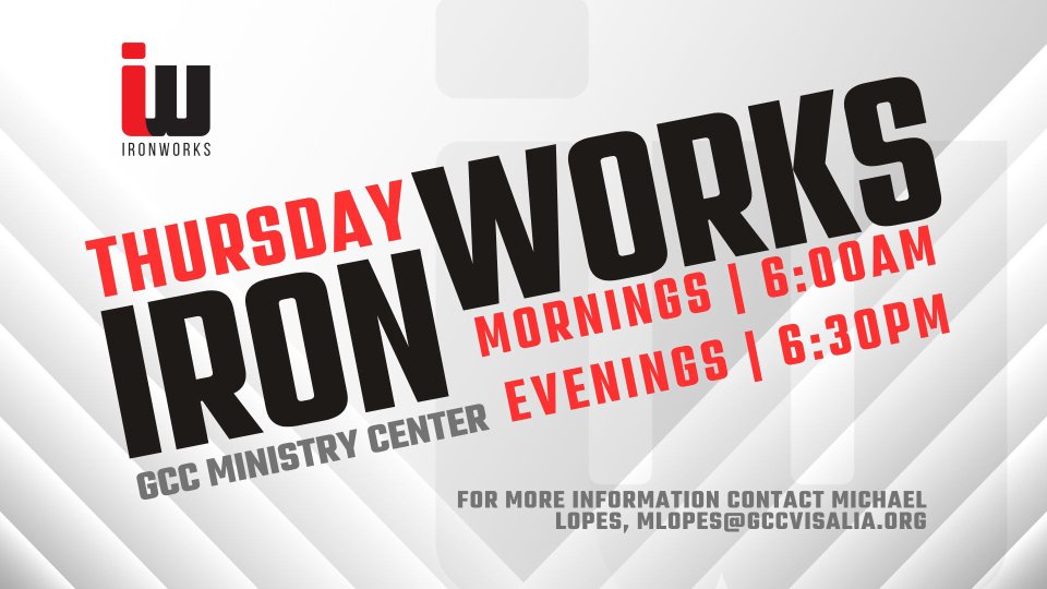 All men are invited to join us on Thursday evenings at 6:30 PM in the Grace Coffee Co. for Bible study, good conversation discussion, and coffee. Ironworks is a men’s group pursuing to grow strong and courageous in the Lord together. For more information contact Michael Lopes, mlopes@gccvisalia.org