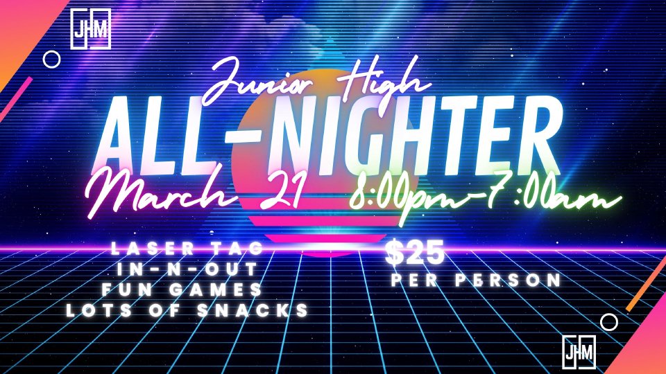 Get ready for an unforgettable night of non-stop fun! We are playing laser tag, grabbing In-N-Out, playing epic games, and fueling up with endless snacks. Sleep is not on the schedule.