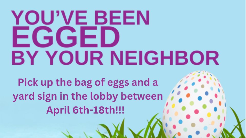 Step 3: Pick up your bag of eggs, yard sign & stake in the lobby anytime between April 6th-18th.