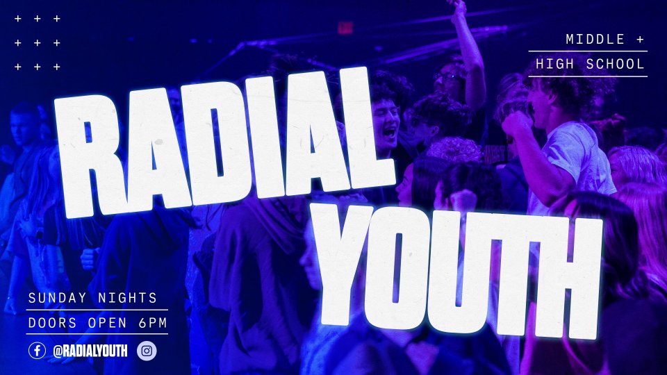 Middle school and high school students meet on Sunday nights. Doors open at 6pm for fun, games and connecting with friends. Don't forget to follow RY on social media @radialyouth.