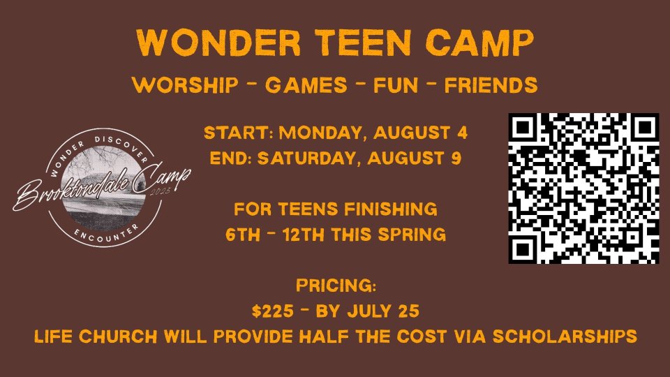 A week of Spirit-led worship, epic competitions, and friendships that last a lifetime. Teens entering grade 7 through graduating seniors - this is your summer!